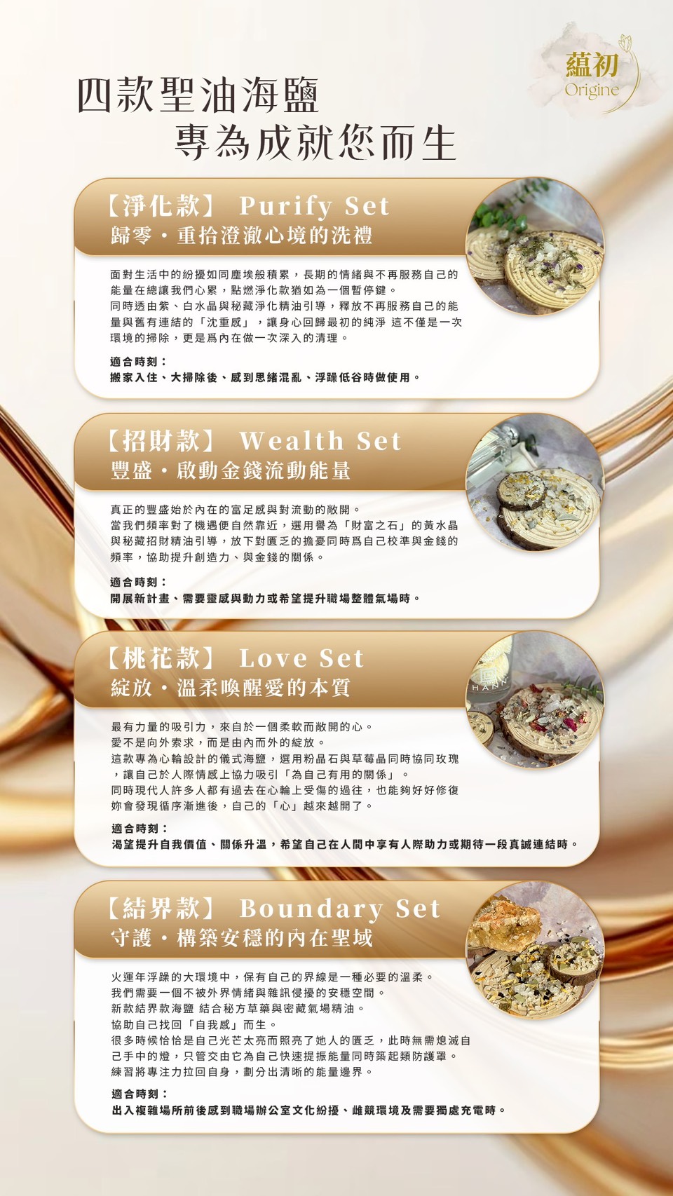 優雅入門組 內容包含: 6 包聖油海鹽(常態三款各 2 包) 適合想先溫柔入門、體驗整體能量照護的妳