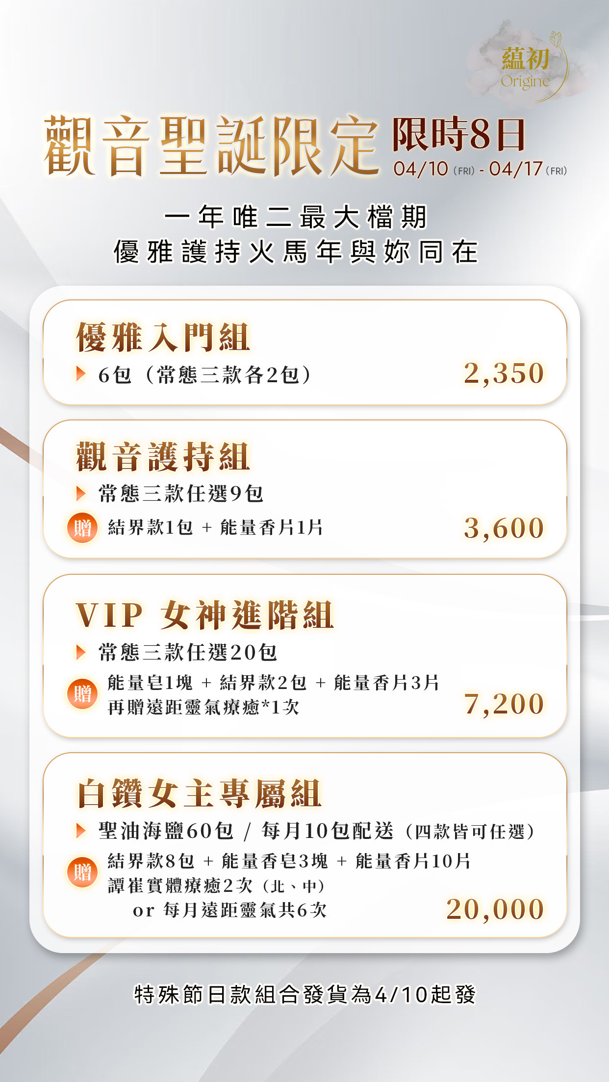 本次為 觀音聖誕限定組合 (年度唯二最大檔期) 於官方賴下單轉帳贈香片 特殊節日款組合發貨時間為 4/10 起發 數量有限依下單順序安排